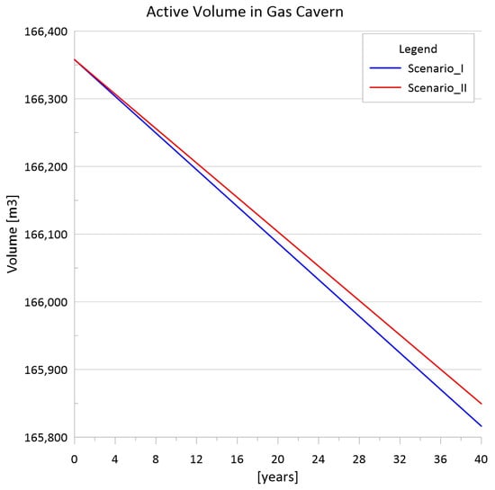 For the natural gas cavern (Figure 6), scenario II is more advantageous due to the smaller decrease in active volume over 40 years of storage operation. However, it should be clearly noted that the differences between both scenarios of gas cavern operation adopted for analysis do not exceed 50 m3 of active volume.