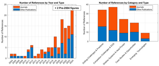 Trends in geothermal publications (2004–2024), illustrating growing research focus on emerging technologies and opportunities (left). The right panel shows the distribution of references by category and publication type, including drilling, design, materials, geomechanics, shallow systems, case studies, and emerging techniques in geothermal research (right).