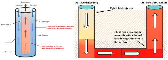 Coaxial and U-shaped geothermal well designs showing the flow of fluid down the annular space or injector well, heat absorption downhole, and the return of fluid to the surface for efficient geothermal energy extraction [40].