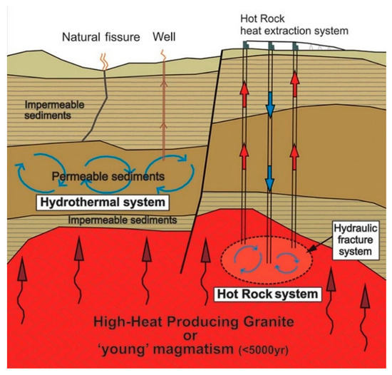 Geothermal energy extraction through hydrothermal and hot-rock systems (EGSs), illustrating fluid circulation in permeable sediments and heat recovery using hydraulic fracture systems within high-heat-producing granite [69].