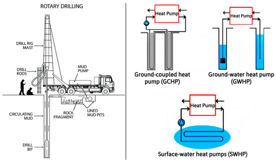 Schematics for a rotary drilling rig, including mud circulation for cooling the drill bit (adapted from [83]). Schematics on the right depict three geothermal heat pump configurations: Ground-Coupled Heat Pump (GCHP), Groundwater Heat Pump (GWHP), and Surface-Water Heat Pump (SWHP) systems (adapted from [80,81] with adjustments to improve labeling and organization).