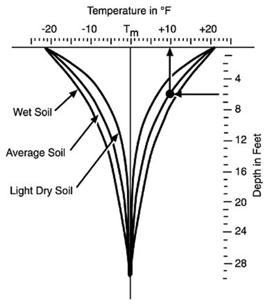 Soil temperature variation with respect to depth for wet, average, and light dry soils. Temperature fluctuations decrease with increasing depth [92].