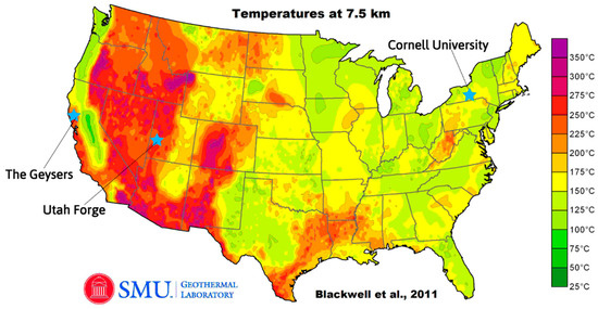Temperature map at a depth of 7.5 km across the United States, showing geothermal gradients with higher temperatures (red to purple) in the western region. Blue stars indicate case study sites: The Geysers in California, Utah FORGE, and Cornell University. Adapted by highlighting the case study sites from [102].