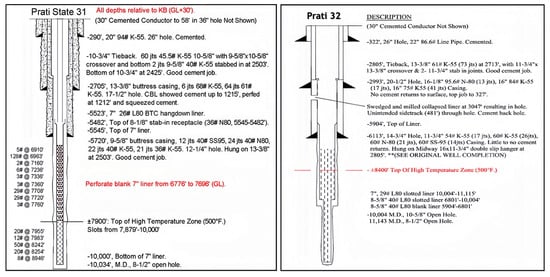 Wellbore schematics for Prati State 31 and Prati 32 at The Geysers, highlighting casing designs, liner configurations, and high-temperature zones critical for geothermal reservoir management [107].