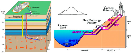 Geothermal systems at Cornell University. Left, a schematic of Cornell’s Earth Source Heat, featuring planned production and injection wells [115]. Right, a schematic of the Lake Source Cooling System [114].
