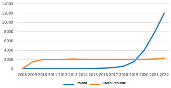 While in some EU countries, the authorities are introducing further facilities for investors to expand the installed capacity of photovoltaics, the governments of the Czech Republic and Poland are introducing regulations that can contribute to slowing down the development of this RES [49]. In the Czech Republic, photovoltaic installations began to be built much faster than in Poland as a result of favorable legal solutions. However, in early 2011 (Figure 3), the Czech government retroactively imposed a 26% tax on the income of previously installed photovoltaic power plants (2009–2010). These solutions inhibited the dynamic development of photovoltaics in the Czech Republic [50].