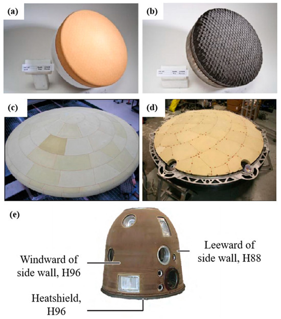 Research into lightweight ablative materials in the United States began in the early 1960s, driven by the requirement to reduce spacecraft structural mass. One of the earliest implementations was a glass fiber/phenolic honeycomb-filled, two-component methylsilicone rubber (DC-325) heat-resistant material, with a density of approximately 0.873 g/cm3, used on the heat shield of the Gemini manned spacecraft. This was soon followed by AVCOAT, a lighter alternative with a density of 0.55 g/cm3, as shown in Figure 2a,b [35]. AVCOAT replaced the silicone rubber with phenolic resin and integrated an epoxy-phenolic resin within a glass fiber/phenolic honeycomb matrix. This composite was further reinforced with functional fillers, such as silica pore beads, phenolic hollow microspheres, and short-cut quartz fibers [36,37,38]. AVCOAT proved its reliability and efficiency throughout all 18 Apollo missions, including manned lunar landings. In the 1990s, with renewed interest in interstellar exploration, AVCOAT was selected as the ablative material for the heat shield of NASA’s next-generation Orion manned exploration spacecraft [39,40,41].