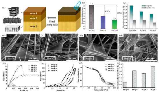 (a1) Schematic of the layered structure and surface densification treatment of carbon fiber-reinforced phenolic resin; variations in (a2) ablative thickness and (a3) thermal conductivity with different composite densities [59]; (b1–b4) microscopic morphologies; variations in (b5) bending stress–strain curve, (b6) compressive stress–strain curve, (b7) thermal conductivity, and (b8) residual mass of composites with different resin concentrations [60].