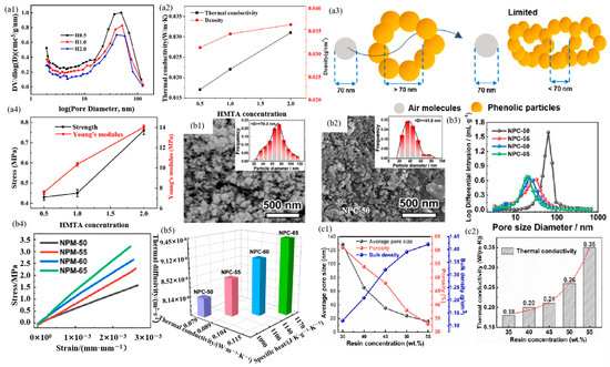 (a1) Variations in pore size distributions of phenolic aerogels with curing agent concentrations [61]; (a2) thermal conductivity and density of quartz fiber-reinforced phenolic nanocomposites with different curing agent contents [61]; (a3) insulation mechanism of nanoporous phenolic matrices [62]; (a4) compressive strength of quartz fiber-reinforced phenolic nanocomposites with different curing agent contents [61]; (b1,b2) SEM morphology and particle size distribution for different resin concentrations [62]; (b3–b5) pore size distribution, stress–strain curves, and thermal conductivity for different resin concentrations [62]; (c1,c2) pore size, density, and thermal conductivity of composites for different resin concentrations [63].