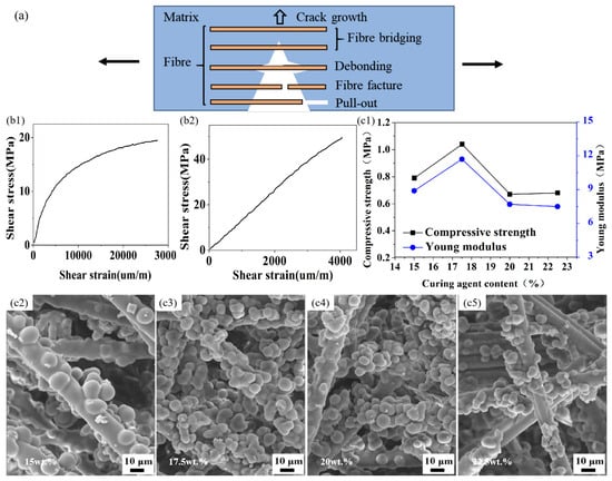 (a) Mechanism of interaction between fiber and resin [65]; shear strength of (b1) the standard curing process and (b2) the post-curing treated phenolic resin composites [66]; (c1) compressive properties and (c2–c5) SEM morphology of silicone/phenolic composite composites with curing agent contents of 15 wt.%, 17.5 wt.%, 20 wt.%, and 22.5 wt.% [67].