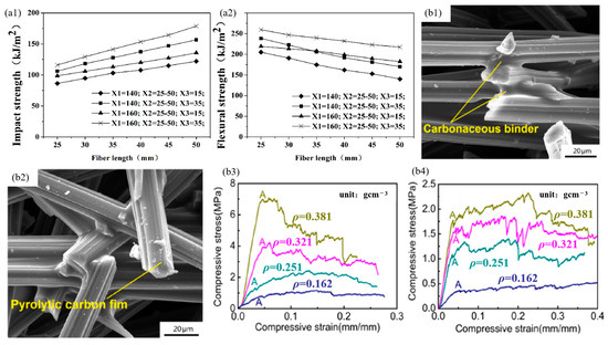 (a1) Impact strength versus fiber length (25~50 mm); (a2) flexural strength versus fiber length (25~50 mm) at constant temperature and curing time [71]; (b1,b2) microstructures of carbon-bonded carbon fiber composites; (b3,b4) stress–strain curves of carbon-bonded carbon fiber composites with different densities [72].