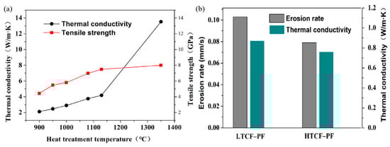(a) Effect of heat treatment temperature on thermal conductivity and tensile strength for polyacrylonitrile-based carbon fibers [75]; (b) linear ablation rate and thermal conductivity of low-temperature and high-temperature heat-treated carbon fiber/phenol composites [77].