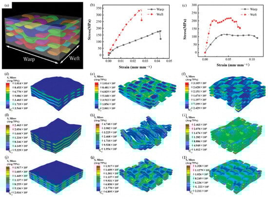Shen et al. [80] used a 2.5D quartz fiber prepreg as a reinforcement, the weave structure is shown in Figure 10a [80], and the 2.5D quartz fiber/nanoporous phenolic resin matrix composite was prepared by sol-gel and an atmospheric pressure drying process using nanoporous phenolic resin as a matrix, and the heat transfer and mechanical properties of the composite were studied. The composites demonstrated anisotropic mechanical properties and fracture behaviors due to the significant warp bending and the straight distribution of weft in the weave structure. As depicted in Figure 10b,c [80], the tensile and bending strengths in the weft direction were both higher than those in the warp direction. The warp direction and weft direction tensile strengths were 184 and 341 MPa, respectively, and the bending strengths were 117 and 220 MPa, respectively. Finite element analysis, shown in Figure 10d–i [80], of the warp direction and weft direction showed that the weft direction had more interface debonding, the material was stressed more evenly, and no obvious stress concentration occurred, resulting in a higher tensile and bending strength. The warp had a greater elongation at break, 4.2% (warp direction) and 2.7% (weft direction), respectively, because the warp yarn was more curved, and the curved warp yarn was gradually straightened during the stretching process. The presence of weft yarn in the weave structure can increase the strength of the composite material, while the presence of warp yarn can increase the elongation at the break of the composite material, so the weave structure eventually increases the overall mechanical properties. Compression analysis along the thickness direction, as presented in Figure 10j–l [80], indicated a predominantly linear compression process, with damage mainly arising from interlaminar cracking between the warp and weft yarns. Furthermore, the incorporation of 2.5D fibers significantly enhanced the shear strength of the resin matrix, suggesting the potential of this design in improving both mechanical performance and durability.