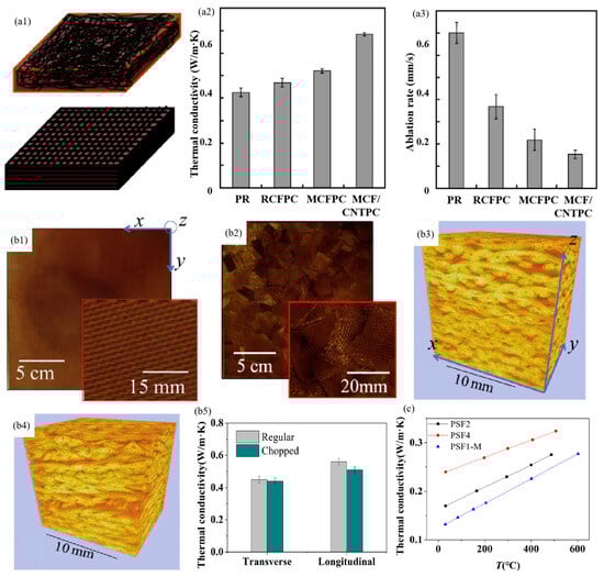 (a1) Morphologies; (a2) thermal conductivity; (a3) ablation rate [86]; (b1,b2) pictures; (b3,b4) 3D rendering pictures; and (b5) thermal conductivity of the regular composite and chopped composite [87]; (c) thermal conductivity of chopped silicon fiber composites [88].