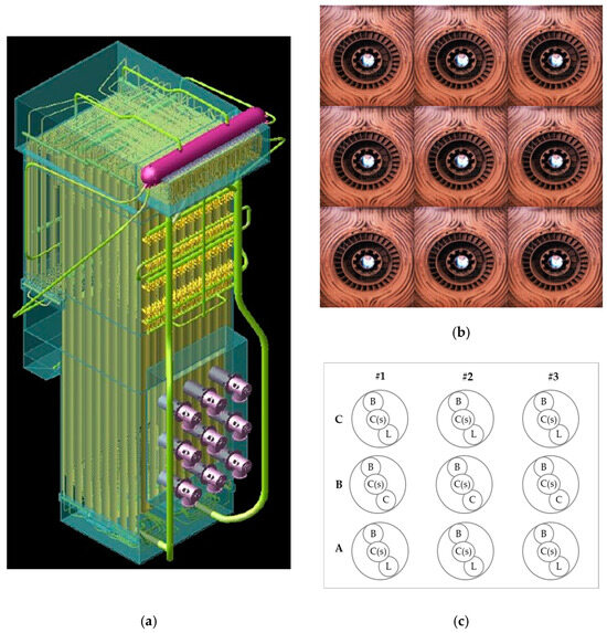 Overall structure of Boiler #8 for steam power generation at Company P. (a) Three-dimensional view of the entire boiler exterior; (b) configuration of the nine burners; (c) nozzle positions for each by-product gas—BFG (B), COG (C(s)), LDG (L)—in the nine burners.