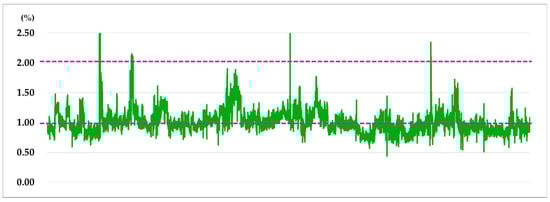Figure 4 shows that manual control based on experience frequently deviates from the appropriate oxygen concentration range of 1–2%. Moreover, data collected over four months indicate that approximately 64% of the measurements fell outside the normal range, making it difficult to maintain balance during the combustion process. This led to increased combustion-specific energy consumption, which in turn reduced the boiler and power generation efficiency.