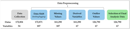 Figure 6 illustrates the data collected for this study and the data preprocessing procedure. At each stage, the processes were implemented to ensure the consistency, accuracy, and quality of the data, which served as an essential foundation for improving the performance of the subsequent analysis model.