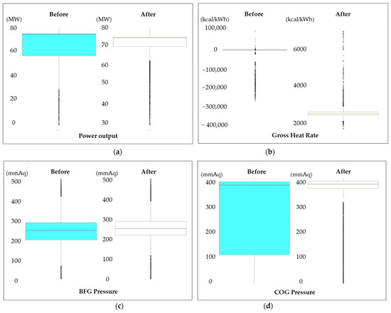 Next, the variables essential for analysis were selected by distinguishing between direct variables and derived variables from the collected raw data. Direct variables included fuel characteristics such as the flow rate, temperature, and pressure of by-product gases (BFG, COG, and LDG), whereas derived variables included variables representing the combustion efficiency. During the variable selection process, the importance and relevance of each variable were considered to efficiently use only the information necessary for analysis. The selected variables played a critical role in predicting and optimizing the combustion patterns.
