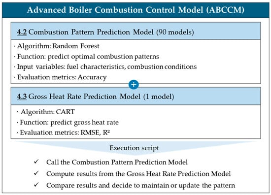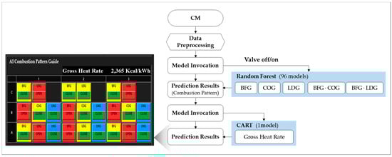 To overcome these limitations, the ABCCM was developed. The ABCCM conducts real-time analysis of by-product gas components, flow rate, calorific value, and pressure to perform immediate combustion control. By combining the random forest (RF) and classification and regression tree (CART) algorithms, the ABCCM can handle nonlinear interactions and derive optimal combustion patterns. It was designed to minimize operator intervention, realizing automated combustion control.