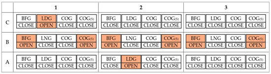BFG is the most commonly used by-product gas, characterized by its low calorific value (750–1000 kcal/Nm3) [58]. COG, with its relatively high calorific value (4000–5000 kcal/Nm3), can contribute to improved power generation efficiency by maintaining stable combustion temperatures and enabling efficient combustion when mixed with BFG [59]. Experimental data show that when the COG ratio is maintained between 20–30%, the oxygen concentration stabilizes at an average of 1.8%, minimizing incomplete combustion. However, if the COG ratio falls below 20%, the combustion temperatures become unstable, leading to excessive oxygen supply, heat loss, and decreased efficiency. Conversely, when the COG ratio exceeds 30%, the temperature within the combustion chamber increases excessively, resulting in increased NOx emissions and reduced combustion stability [59]. LDG, with its moderate calorific value (approximately 2000 kcal/Nm3), is classified as a less efficient fuel compared to BFG [60]. When the LDG ratio falls below 40%, the combustion temperatures become unstable, and excessive oxygen supply leads to heat loss.