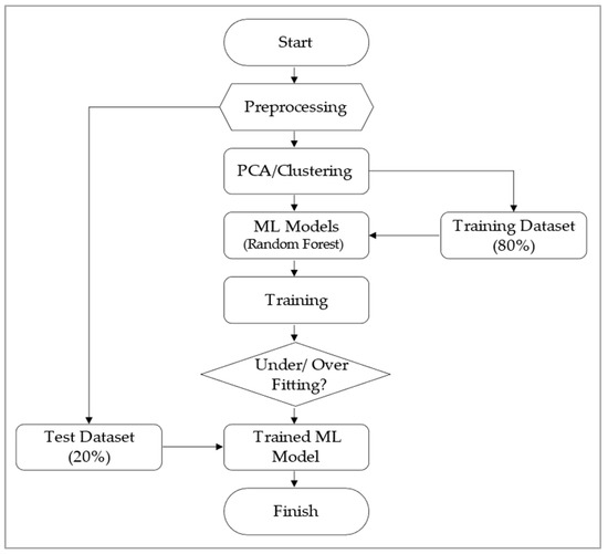 This paper is structured as follows: Section 2 reviews prior studies on improving power boiler efficiency, utilization of by-product gases in the steel industry, and AI-based boiler combustion optimization, presenting recent research trends and highlighting the differences between this study and existing research. Section 3 details the collection and preprocessing of 126,790 data points gathered from Company P’s real-time operational data (PosFrame) between December 2020 and April 2021. The data preprocessing procedure included handling missing and outlier values, variable transformations, and standardization. Principal component analysis (PCA) and clustering were performed to construct a dataset for model training. Section 4 describes the design of the ABCCM, which combined a combustion pattern model based on the RF algorithm with a gross heat rate prediction model based on the CART algorithm. Section 5 evaluates the ABCCM’s performance by applying it to Company P’s real-time operational environment. The results of the combustion pattern adjustments and gross heat rate predictions were analyzed in real time to demonstrate energy savings and improved combustion efficiency. Section 6 analyzes the economic effects of implementing the ABCCM by evaluating Company P’s internal rate of return (IRR) and net present value (NPV). The possibility of expanding the model to Company P’s entire power generation system is also discussed. The research process is illustrated in Figure 5.