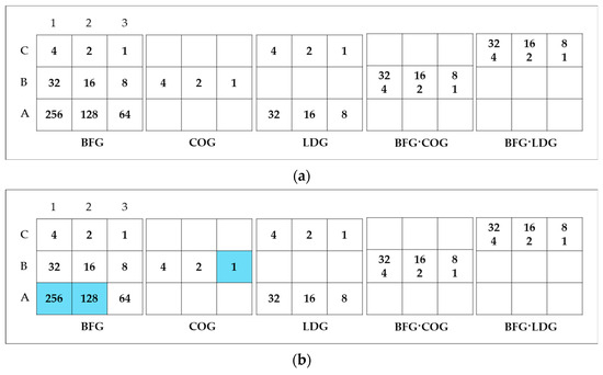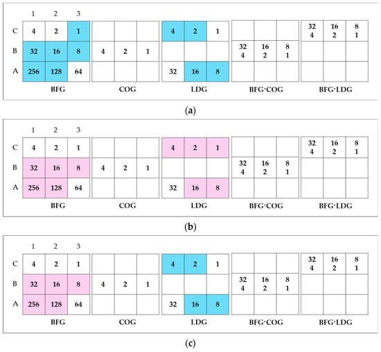 However, these gases are valuable and can be recycled to reduce costs and protect the environment. BFG, in particular, has approximately 20 times the flow rate of other by-product gases and can be used as a fuel for self-generation [10]. However, when BFG is used as a standalone fuel, its relatively low calorific value and slow combustion rate can reduce the boiler’s thermal output. Conversely, COG, with its high calorific value, can enhance combustion efficiency and stabilize combustion when mixed with BFG [11]. Table 2 presents the detailed compositions, calorific values, and production volumes of these by-product gases [5].
