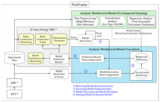 The data used in this study were real-time data collected to optimize the combustion patterns of the steam power generation boiler system, using the PosFrame framework developed by Company P. PosFrame refers to a common hardware and software environment that provides operational, quality, and equipment data, enabling macro- and micro-data retrieval, correlation analysis, and AI-based analysis [61]. The data collected from field equipment were stored in the PLC and DAQ servers in the operations room, transferred via P/C and HMI, and ultimately stored and extracted in the cloud through the PosFrame manufacturing execution system (MES) for long-term storage, analysis, and utilization. The data stored in the MES were designated as categorical regardless of their attributes, so conversion to numerical data were necessary. Based on the Knowledge Discovery in Database (KDD) analysis methodology, preprocessing was conducted following the steps outlined below to develop a reliable model [62].