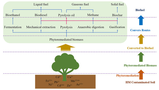 Phytoremediation is a process in which plants uptake contaminants from soil, thereby reducing the environmental risks associated with undesirable elements [24]. However, since metals are non-biodegradable, their phytoextraction can pose various environmental threats. The selection of an optimal phytoremediation strategy depends on levels of soil contamination and the capabilities of different plant species [25,26]. Various methods have been employed to manage remediated biomass containing accumulated HMs, including biofuel production, combustion, liquid extraction, composting, and metal recovery [19,27,28]. Biofuels derived from this biomass can be classified according to their form as gaseous (methane), liquid (biodiesel, bioethanol, and bio-oil), or solid (biochar).