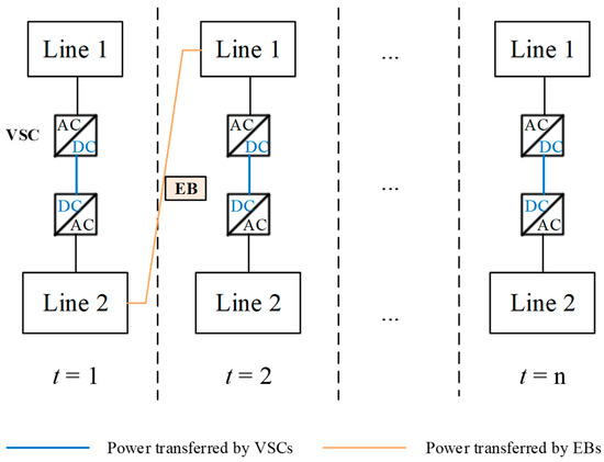 Both VSCs and EBs enhance the flexibility of the distribution network, as shown in Figure 2. VSCs enable flexible power transfer across the distribution network spatially, while EBs contribute flexibility both temporally and spatially. However, the adjustment capacity of VSCs is limited by their own capacity, and EB participation is constrained by their transportation schedule. Therefore, the coordinated operation of VSCs and EBs during power dispatch is essential to optimize performance. Without coordination, there is a risk of overcompensation, where both VSCs and EBs transfer energy in the same direction simultaneously. This paper proposes a coordinated optimization strategy for VSCs and EBs, ensuring full utilization of the flexible transmission capacity of VSCs and the flexibility of EBs, ultimately improving power quality and enhancing the distribution network’s capacity to integrate new energy sources and loads.
