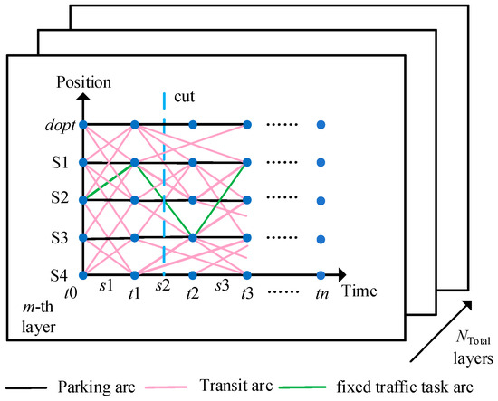 The multi-layer stochastic TSN modeling method can more accurately describe the movement of vehicles at each moment [17]. However, unlike the ordinary situation, the dispatching of EBs needs to be carried out without affecting their normal transportation tasks. Therefore, to ensure the normal execution of the public transportation tasks of EBs, public transportation task constraints are further added to the multi-layer stochastic TSN model, as shown in Figure 3.