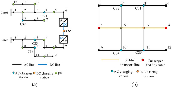This paper focuses on the distribution and traffic networks in the area shown in Figure 4. The power regulation of the distribution network and the dispatch of electric buses for charging and discharging between 6:00 and 18:00 are evaluated to verify the effectiveness of the proposed coordinated optimization method. To reduce the calculation time, only one bus route is selected for simulation, and the distribution network is simplified accordingly.
