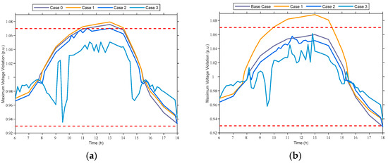 Voltage variation in each example. (a) Line 1 maximum voltage changes; (b) Line 2 maximum voltage changes.