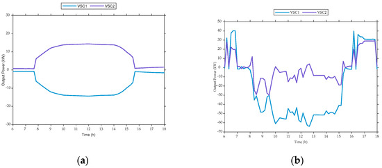 In Case 1, the VSC power transmission is shown in Figure 6. Due to higher distributed photovoltaic (DPV) penetration in substation area 1, excess PV output is transferred to substation area 2 through the VSC to balance the load. However, the high PV integration prevents full absorption of the transferred power, exacerbating high-voltage problems in both substations while also increasing total network loss. From 16:00 to 18:00, the VSC’s reactive power compensation helps alleviate the low-voltage issues in both substations.