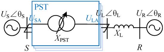 The equivalent schematic diagram of a transmission line after installing a TCPST is shown in Figure 2. US and UR are the sending and receiving voltages, respectively; UL is the voltage after phase shifting. Xpst is the reactance of the TCPST, and XL is the equivalent reactance of the line. The sending voltage source US transfers active power through TCPST, and the specific transmission active power value can be derived as Equation (1). As shown in Figure 3 and Equation (1), the TCPST modifies its voltage taken up in the transmission line by altering the impedance value of the XPST, thereby modifying the amplitude and the phase of the output voltage UL of the TCPST as well as the value of the active power transmitted to the receiving voltage source UR.