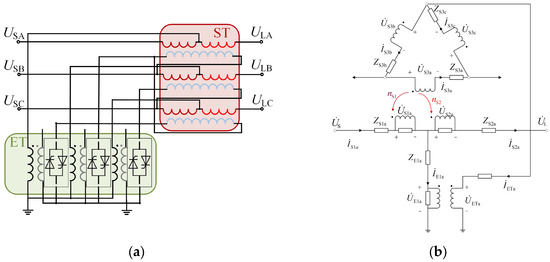 Nevertheless, the present focus of research into TCPSTs is mainly on power flow control optimization, control strategy improvement, system transient stability, and parameter design [12,13,14]. There is a paucity of research in the topological design of TCPSTs. The conventional TCSD-TCPST is only capable of modifying the phase angle of the voltage, necessitating the involvement of a step-up/down transformer to alter the amplitude of the voltage. The independent fast thyristor-controlled phase-shifting transformer (IF-TCPST) was proposed to simplify the structure and to independently adjust voltage amplitude [15]. However, the range of the voltage amplitude and phase-shifting angle of IF-TCPST are still limited. The combination of the step-up/down transformer and the TCSD-TCPST allows for the modification of the voltage amplitude and phase angle separately in a two-core step-up/down thyristor-controlled phase-shifting transformer (TCSUD-TCPST) composed of the series transformer (ST) and the excitation transformer (ET). This proposed approach offers the benefits of saving floor space and reducing investment costs without the separate step-up/down transformer, while the ratio of ST is affected by the grid line parameters. By merging the ST into the part of the ET, the single-core step-up/down thyristor-controlled phase-shifting transformer (SCSUD-TCPST) allows for the modification of the voltage amplitude and phase angle separately using a simpler single-core structure, and its ratio is not affected by the grid line parameters.