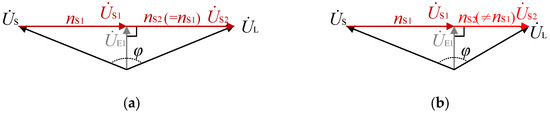 (a) Voltage phasor relationship of TCSUD-TCPST with an equal value of ns1 and ns2; (b) voltage phasor relationship of TCSUD-TCPST with different values of ns1 and ns2.