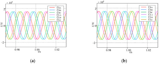 As shown in Figure 7 and Figure 8, SCSUD-TCPST and TCSUD-TCPST both have relatively excellent phase-shifting characteristics. As for their amplitude regulation characteristics, the step-up/down voltage amplitude and the phase-shifting angle of the SCSUD-TCPST can be decoupled by (25) and (26) and regulated by nE1 and nE2, which allows the amplitude of the UL to be regulated to 0.5 p.u. with the arbitrary phase-shifting angle, as shown in Figure 8a. Meanwhile, due to the coupling relationship between the amplitude and the phase-shifting angle of the TCSUD-TCPST, as shown in Figure 8b, when the TCSUD-TCPST is controlled to achieve a 0.5 p.u. step-down voltage, its phase-shifting angle is limited and cannot be 0, which is consistent with the aforementioned conclusion.