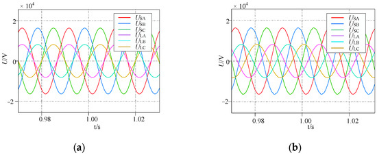 As shown in Figure 9 and Figure 10, the output active power of TCSUD-TCPST and SCSUD-TCPST is required to be regulated from 100 MW to 50 MW at 2 s. The voltage waveform of TCSUD-TCPST and SCSUD-TCPST around 2 s indicates that they can be regulated smoothly and rapidly through thyristor control, and the active power can reach the target value within 0.2 s with minimal current oscillation. Compared with Figure 9 and Figure 10, SCSUD-TCPST exhibits superior dynamic performance in comparison with TCSUD-TCPST, which demonstrates reduced power and current oscillation. This finding further verifies that SCSUD-TCPST is more recommended for engineering applications.
