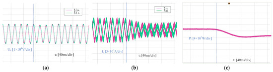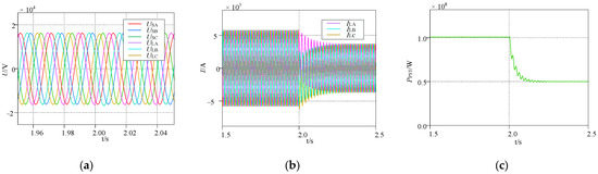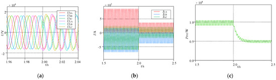 Power flow regulating waveforms of TCSUD-TCPST at 2 s: (a) the voltage waveform; (b) the current waveform; (c) the active power waveform.