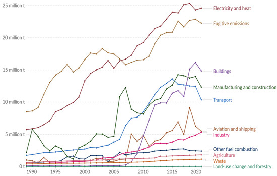 In Oman, the majority of carbon dioxide (CO2) emissions are caused by natural and human factors [11]. Table A2 in the Appendix lists the primary causes of Oman’s greenhouse gas emissions. The CO2 emissions by sector in Oman are shown in Figure 1.