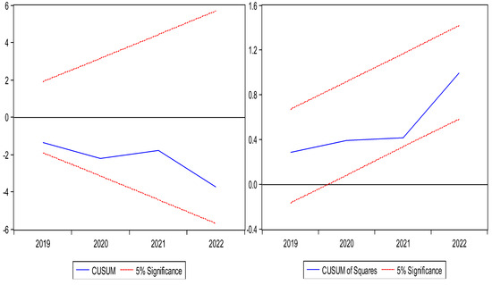The long-run equilibrium value is forthrightly attained if the ECM coefficient is between 0 and −1. If the ECM coefficient is between −1 and −2, the error correction procedure is stated to progress as reducing fluctuations around the long-run balance. The equilibrium has been moved away if the coefficient is more than −2 or positive. Lastly, Brown et al. [59] proposed that the CUSUM and CUSUMSQ tests be used to evaluate the stability of the model. When a structural break occurs, time series data can be subjected to the CUSUM and CUSUMSQ tests.