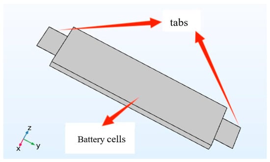 The three-dimensional model constructed in this study is shown in Figure 1. Based on the overall geometric parameters of the battery, reasonable simplifications were made: the battery cell was replaced by a rectangular domain, and the thin sheets on both sides were modeled as the tabs. An idealized air domain was used to replace the airflow field model; that is, the simulated ambient temperature remained constant, and there was no fluid flow in the air domain. Table 3 lists the relevant parameters involved in the thermal model.