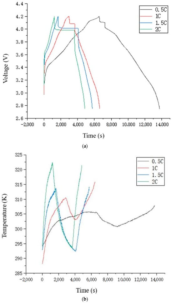 Four thermocouple leads are used to register temperatures. One is bonded to the center of the battery surface to measure the battery’s working temperature; one is placed near the terminal tabs to monitor the temperature of the tabs, and the other two are used to monitor the ambient temperature. All four thermocouples are connected to the battery testing system. The BTS software is used to set up a constant current charge and discharge mode (i.e., constant current charging and constant current discharging) for the experimental battery. The charge and discharge cycles are performed at different rates. For the series of experiments, the constant current charging cut-off voltage is consistently set to 4.2 V, and the constant current discharging cut-off voltage is consistently set to 2.75 V, with three cycles of charge and discharge. During both charging and discharging and between discharge and charge, the resting times are set as 600 s (for 0.5 C and 1 C rates) and 2400 s (for 1.5 C and 2 C rates) to allow for sufficient heat dissipation. For low charge/discharge rates (0.5 C and 1 C), a single channel of the testing system is sufficient for the experiment. However, for high charge/discharge rates (1.5 C and 2 C), two parallel channels of the battery testing system are used to meet the required current. Additionally, a temperature protection limit of 65 °C is set (the experiment will automatically stop and trigger an alarm if the battery temperature reaches 65 °C) to prevent overheating.