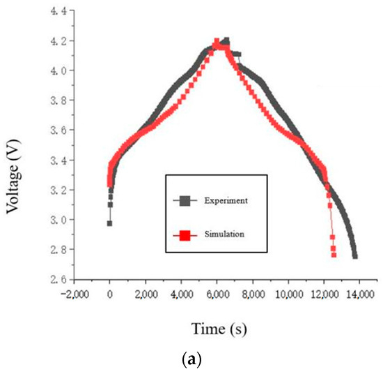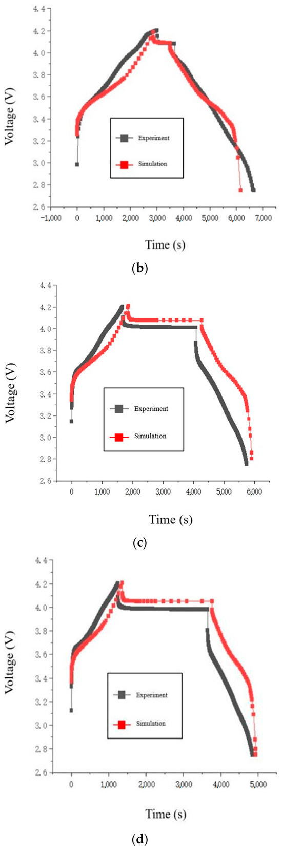 The simulation model’s charge and discharge voltage curves at low rates (0.5 C, 1 C) match well with the experimentally measured curves. Since the simulation software cannot read parameter models at fixed time intervals, an estimation of the maximum absolute voltage error by comparing the voltage curves shows that it does not exceed 0.1 V, indicating acceptable simulation accuracy. When comparing the simulation model’s charge and discharge voltage curves at high rates (1.5 C, 2 C) with the experimental curves, the voltage curves during the charging and rest phases match well. Near the end of charging, the maximum absolute voltage error reaches up to 0.18 V. The voltage trend of the simulation model during the discharge phase is similar to that of the experimental measurements, but the voltage values differ by a fixed margin. Considering that during the rest and discharge phases at high discharge rates, the polarization effect in the experimental battery is more sensitive to the discharge rate than in the simulation model. The experimental battery experiences a larger voltage drop during discharge. Subsequently, the voltage trajectory in the simulation model consistently maintains the voltage difference from the moment the battery starts discharging. Therefore, the simulation model is able to accurately simulate the experimental battery behavior at low charge/discharge rates.