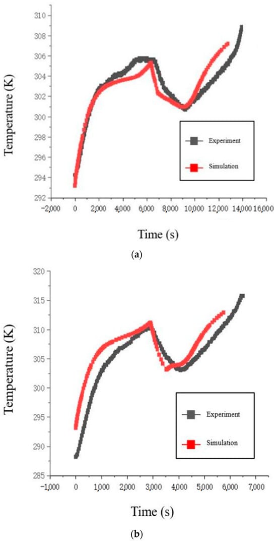 During the simulation analysis at four different charge/discharge rates, the initial battery temperature was fixed at 293.15 K, and the ambient temperature was fixed at 298.15 K. The temperature and voltage curve fitting results during the charging phase for all four rates were relatively good (it is worth noting that the temperature error at the 1 C rate is due to the discrepancy between the experimental and model preset initial battery temperatures). In the later stage of the simulation model’s idle phase, at low charge/discharge rates, the battery had not yet reached complete heat dissipation, so the temperatures of the model and experiment overlapped. At high charge/discharge rates, the battery temperature in the simulation model stabilized at the preset ambient temperature, and the experimental battery temperature also stabilized at the laboratory ambient temperature, with temperature differences due to the ambient temperature being reasonable. During the discharge phase, at low discharge rates, the maximum temperature error at 0.5 C and 1 C was no more than 2 K, which was acceptable in terms of accuracy. At high discharge rates, at 1.5 C and 2 C, the difference in ambient temperature led to different initial battery temperatures, causing slight deviations in the temperature trend during the discharge phase, but the temperature differences remained within the acceptable accuracy range. It is important to note that part of the temperature error arises from the fact that the simulation model directly obtains temperature data from the battery surface, which is more precise. Whereas the experimental battery temperature is obtained using a thermocouple device attached to the battery surface with transparent tape (the transparent tape is used to ensure the thermocouple remains in constant contact with the battery surface). The difference in temperature measurement methods contributes to unavoidable errors.