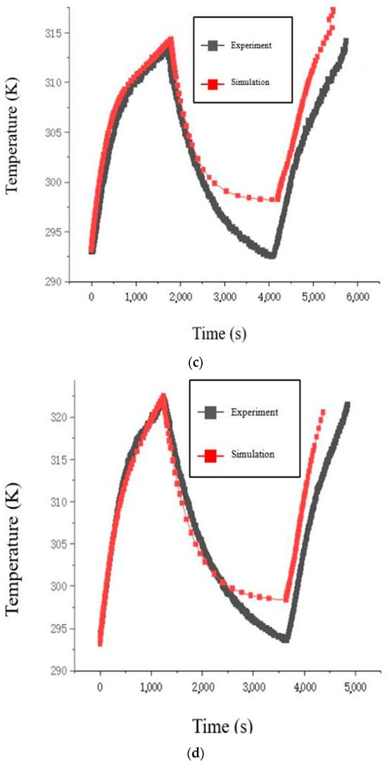 During the charge-discharge experiments at four different rates, the battery temperature curve follows an “N” shape. From the start of charging to the rest state, the battery temperature gradually increases. During charging at different rates, the battery temperature can reach up to 305.65 K (0.5 C), 310.55 K (1 C), 313.55 K (1.5 C), and 322.35 K (2 C). Upon reaching the rest state, the temperature begins to gradually decrease. As shown in Figure 3, during the 0.5 C and 1 C charge/discharge rate experiments, the battery temperature did not return to the initial temperature or room temperature when the rest state ended. This is likely because the rest period was insufficient, and the battery had not completely dissipated the heat. In contrast, during the 1.5 C and 2 C rate experiments, the battery temperature returns to its initial temperature by the end of the rest state, and the temperature at the end of discharge is nearly the same as that at the end of charging. The curves are almost symmetric around the center. From the comparison of the four sets of experiments, it can be seen that as the charge/discharge rate increases, the slope of the temperature curve during charging and discharging becomes steeper, meaning that more heat is generated per unit time, and the battery temperature at the end of charging is higher.