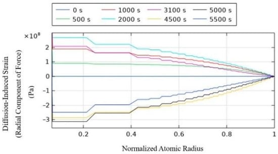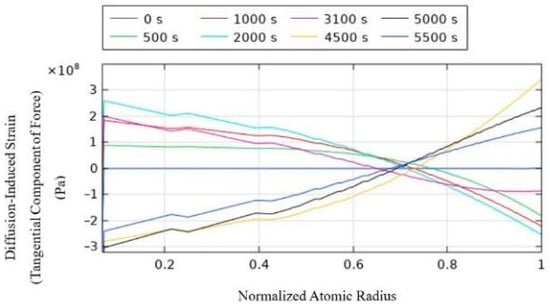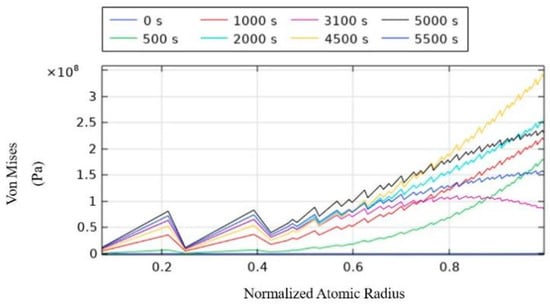 As for the Von Mises stress experienced by the particles given in Figure 7, it increases gradually along the radial direction at the same moment, reaching a maximum of 0.35 GPa, which is still below the yield strength of silicon-carbon anodes. Therefore, the particles undergo elastic deformation without plastic deformation [13,14].