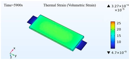 Figure 8 presents the thermal strain in the main body of the battery. For the overall thermal expansion of the battery, the maximum thermal strain occurs at the junction between the tab and the battery body, with the highest volumetric thermal expansion rate of up to 0.0327%. The compression between the tab and the battery body exacerbates the thermal strain. Excluding the tab-battery connection, the maximum thermal strain in the overall battery occurs at the center, with a volumetric thermal expansion rate of up to 0.0198%, decreasing outwardly, while the thermal expansion at the tab body is minimal, with a volumetric thermal expansion rate of only 0.0047%. Simulations and experiments observing no significant deformation of the battery during charge and discharge tests demonstrate that at a 1 C charge/discharge rate, the overall thermal expansion of the battery remains within a reasonable range.