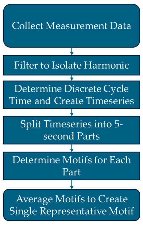 We propose that power electronic devices can be identified by analysing the cycle length of harmonic emissions, which have an on-average constant frequency, but which has recurring variations in the length of individual cycles of the harmonic centre frequency. IEC defines the harmonic order as “The integral number given by the ratio of the frequency of a harmonic to the fundamental frequency” [7], while the fundamental itself is defined as “The component of order 1 of the Fourier series of a periodic quantity” [7]. IEC [8] indicates that when measuring harmonics, the fundamental should be taken as the power system frequency, and the Fourier transform should be made over ten fundamental cycles in a 50 Hz power system. This means that the measuring window is approximated to 200 ms, resulting in a frequency resolution of 5 Hz. Our proposed approach is related to the concept of instantaneous frequency as described by [9]. Instead of trying to establish a continuously defined phase angle, unwrapping and integrating it to obtain the instantaneous frequency of the signal, we take a different approach. We use the length of each cycle, which we refer to as the Discrete Harmonic Cycle Time (DHCT). This allows us to create a time series whose amplitude is given by the cycle lengths of a selected harmonic. Huang [10] proposed that statistical methods in combination with the Generalised-Zero Crossing (GZC) method could be used to analyse the intrinsic modes isolated by empirical mode decomposition. While GZC can detect quarter cycles, we propose using full cycle lengths to reduce random noise. Using a full cycle is equivalent to averaging over the quarter cycles, reducing the noise level by a factor of four. Instead of statistical methods, we employ data mining, specifically matrix profiling, to extract the relevant features and use these for signal comparison.