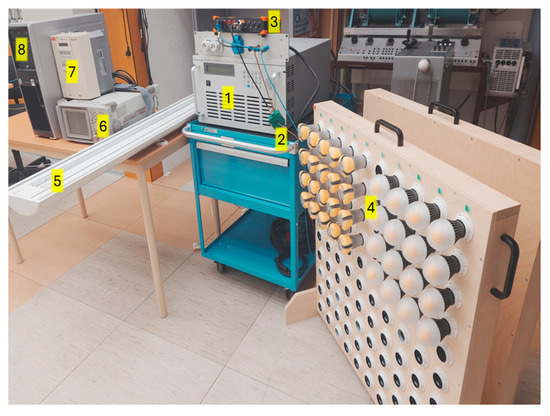 Overview of the devices used in this study: 1. controllable voltage supply; 2. current probe; 3. data acquisition system; 4. LED array; 5. fluorescent tube; 6. spectrum analyser; 7. variable frequency drive; 8. workstation. The devices were connected directly to the CVS and the current was measured using the current probe placed around the phase wire.